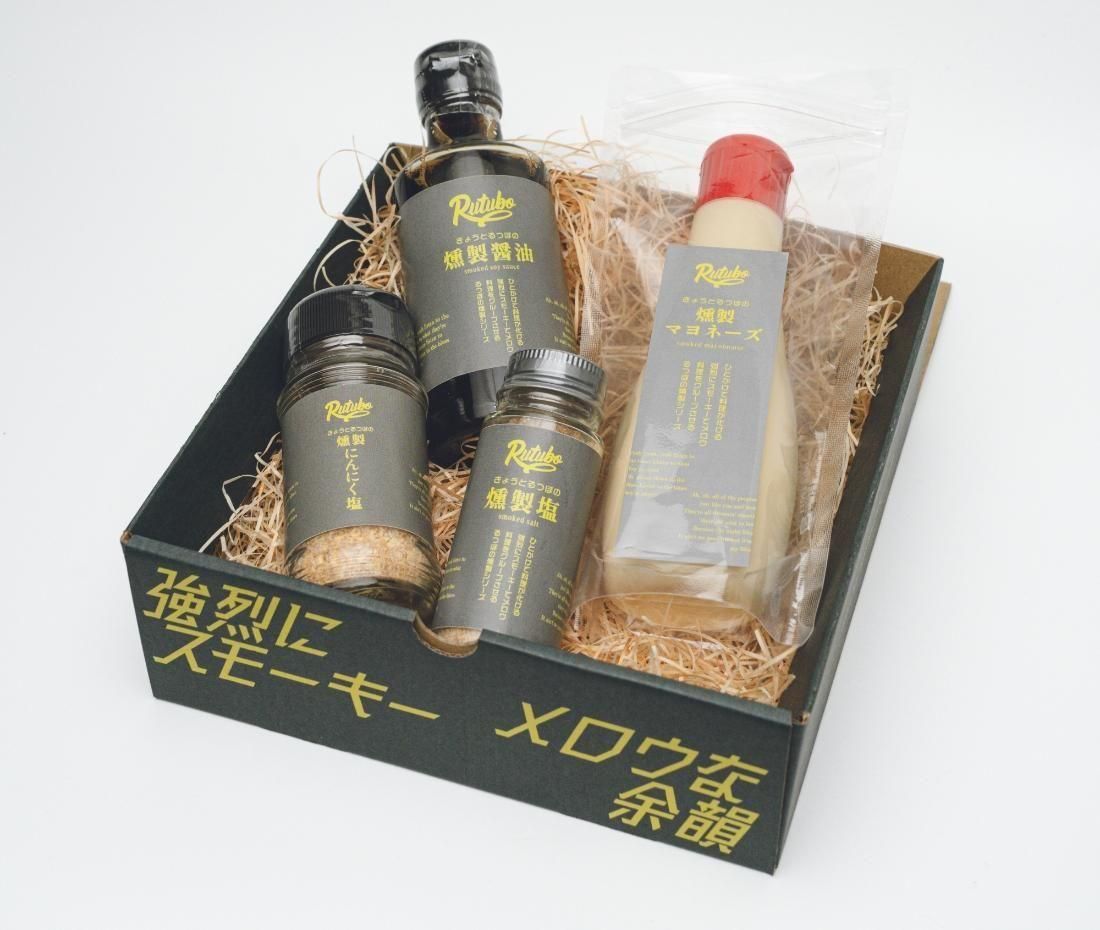 | 内容量 | 燻製マヨネーズ: 200g 燻製醤油: 200g 燻製塩: 68g 燻製にんにく塩: 85g |