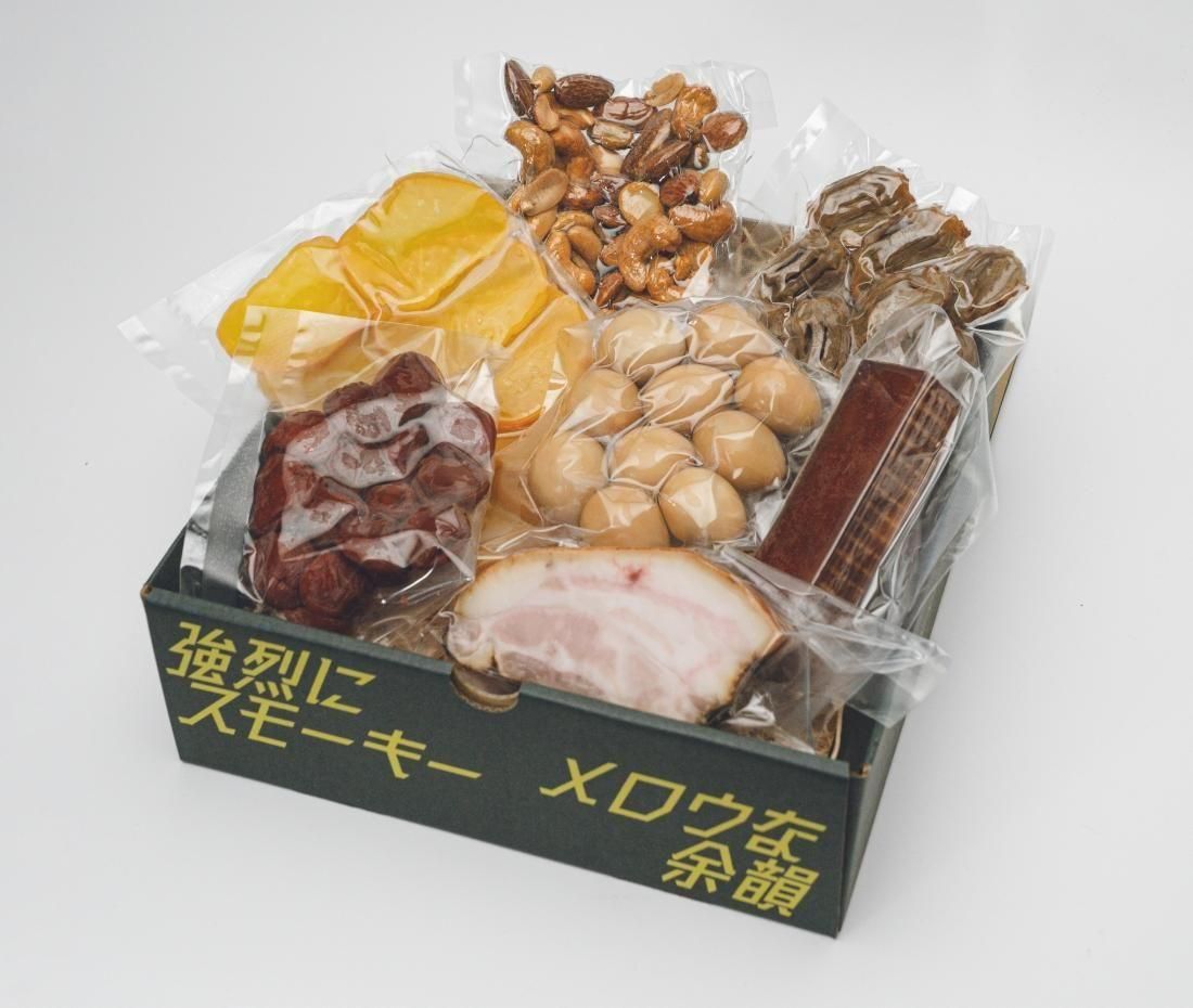 | 内容量 | 燻製チーズ: 1本 燻製ミックスナッツ: 75g 燻製うずら: 10粒 燻製梅干: 125g 燻製砂肝: 75g 燻製たくあん(いぶりがっこ): 100g 燻製ベーコン: 100g |